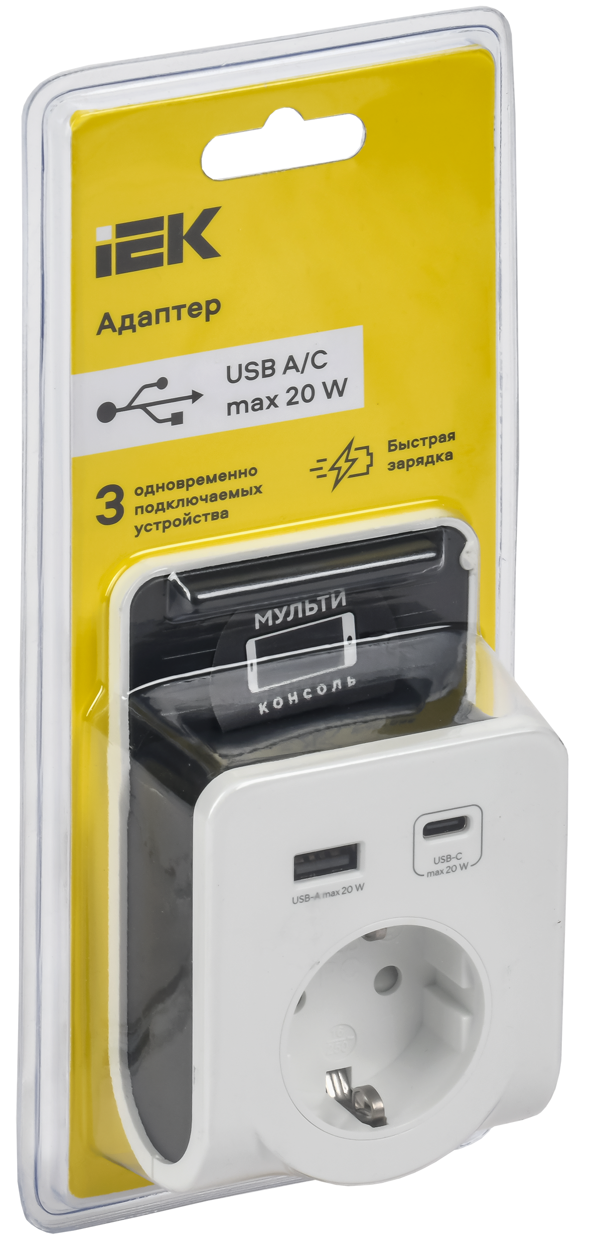 Адаптер Т-03/01 1 место 2P+PE 16А 2хUSB A+C 20Вт с подставкой бело-черный IEK WTP11-16-01-1A1C-ZU-K01